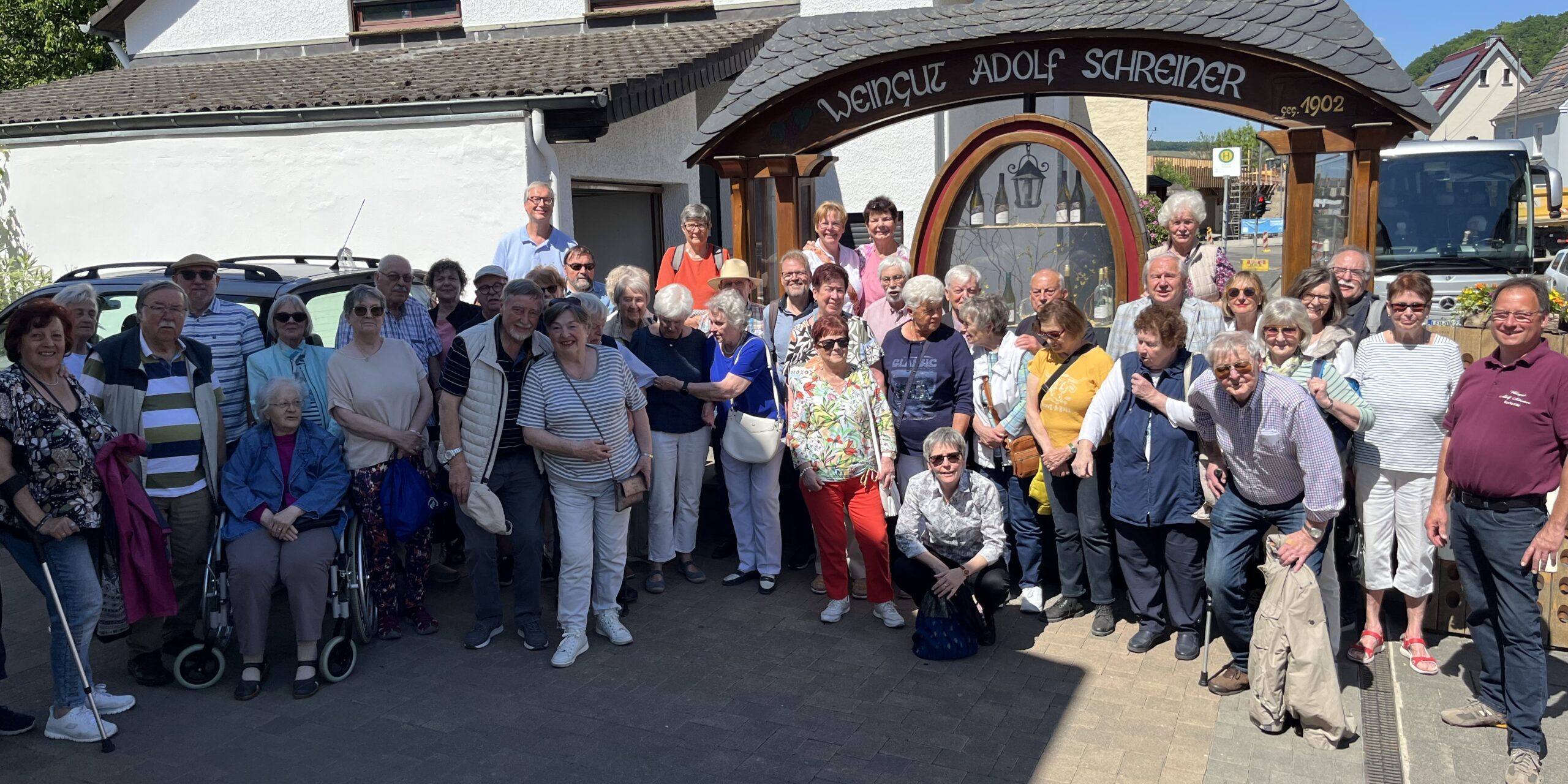Nach gut zwei Stunden in Ahrweiler fuhr der Tross durch das Ahrtal über Walporzheim, Marienthal und Dernau weiter nach Rech zur zweiten Station des Ahrtalbesuches. Sie führte ins Weingut Adolf Schreiner, ein kleines Weingut, das seit über 120 Jahren als Familienbetrieb und in nunmehr vierter Generation von Winzer Adolf Schreiner geführt wird.